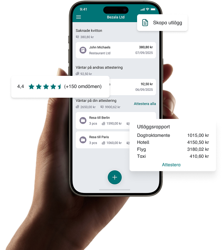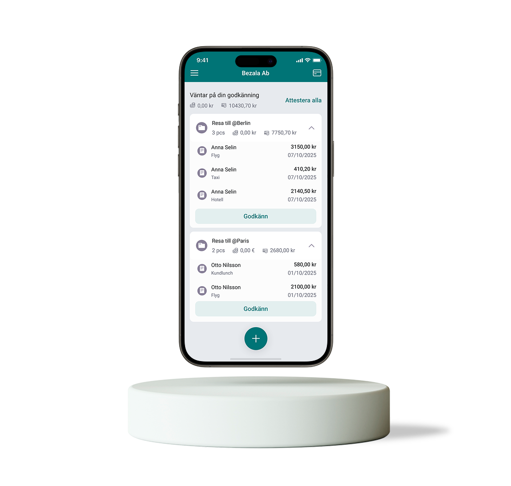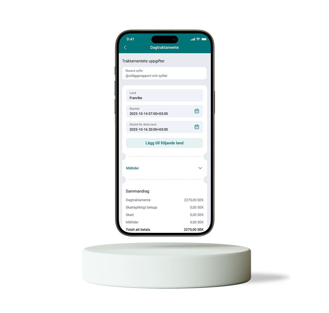 Ditt team kan enkelt skicka in kvitton, milersättningar och traktamenten, medan du kan godkänna dem med ett enda klick. Vi tar hand om traktamentsberäkningar baserat på lokala regler och vi sköter också smidigt om rese-ersättningarnas bokföring och myndighetsrapportering.